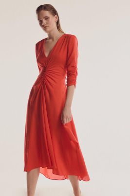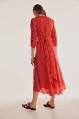 De Pedro del Hierro, este vestido en rojo teja de escote en V drapeado, muy fluido.