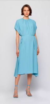 En azul serenidad, este vestido midi de escote fruncido muy fresco.