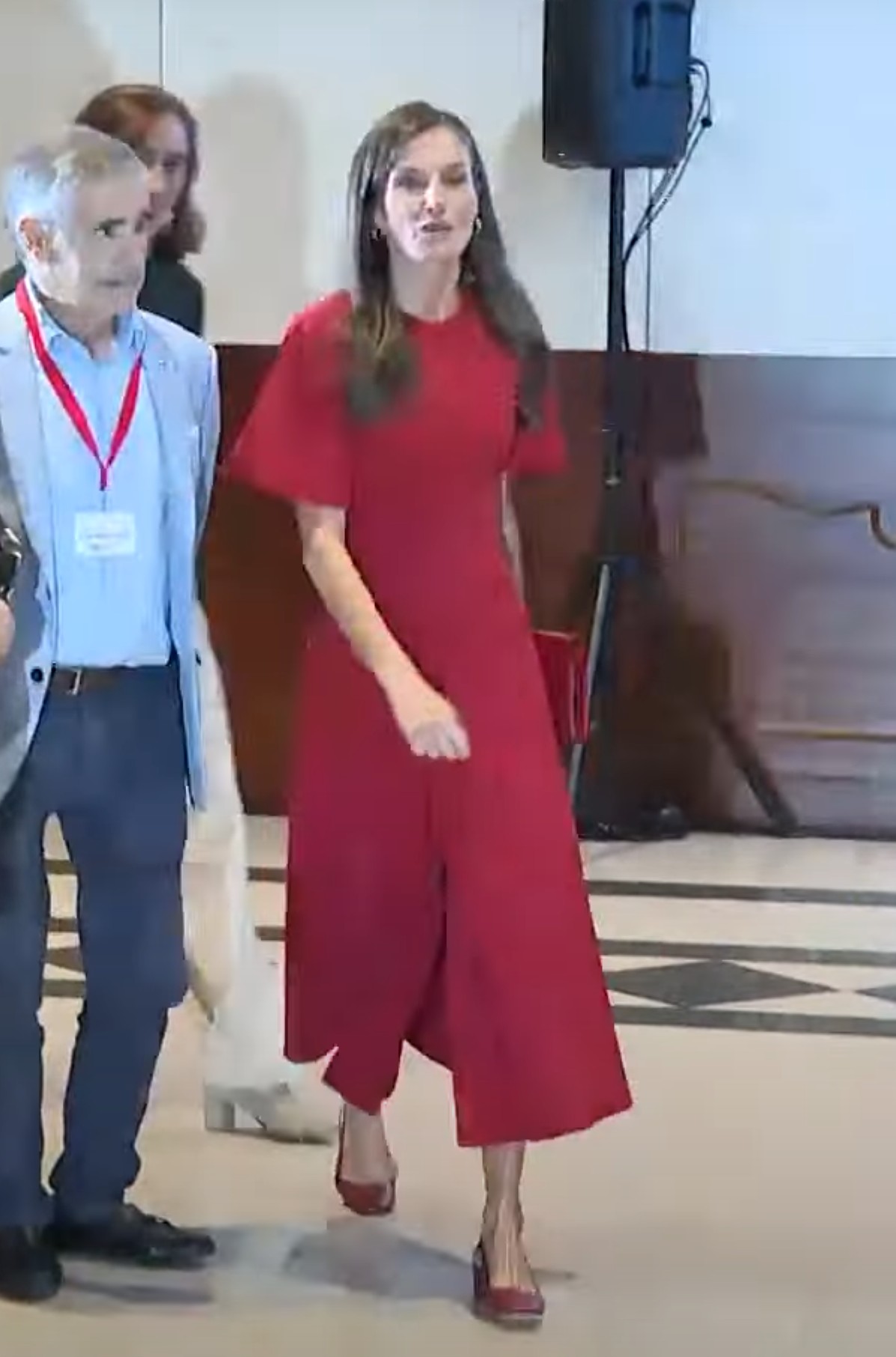 A este acto letizia asistió de rojo con un traje bien planchado, lo cual se agradece, aunque la altura de la parte baja (creo que son unos pantalones anchos) no le favorece su pierna demasiado delgada.