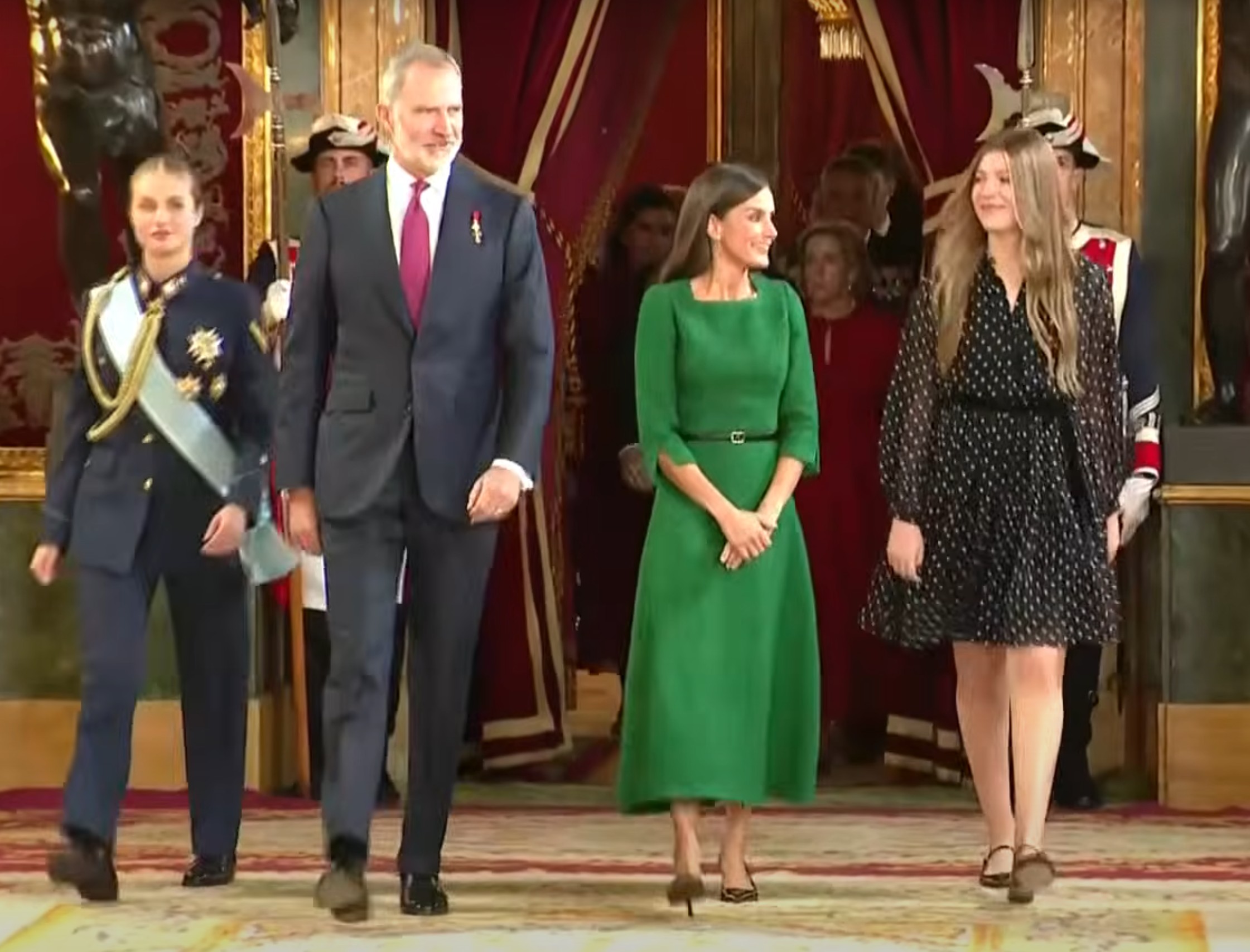 Letizia salió con un vestido verde de altura desfavorecedora para sus piernas delgadas, que la hacía ver más bajita. Afortunadamente, ella es la mujer más alta de los últimos dos siglos, por lo tanto nadie notó el efecto óptico. Honestamente, parecía que viniera de hacer los quehaceres en cualquier hogar del mundo, con las manos rojas de lavar los platos y fregar los pisos. Nada que destacar de ese atuendo tan pobre, sin joyas, sin accesorios, sin un peinado bonito, sin nada.