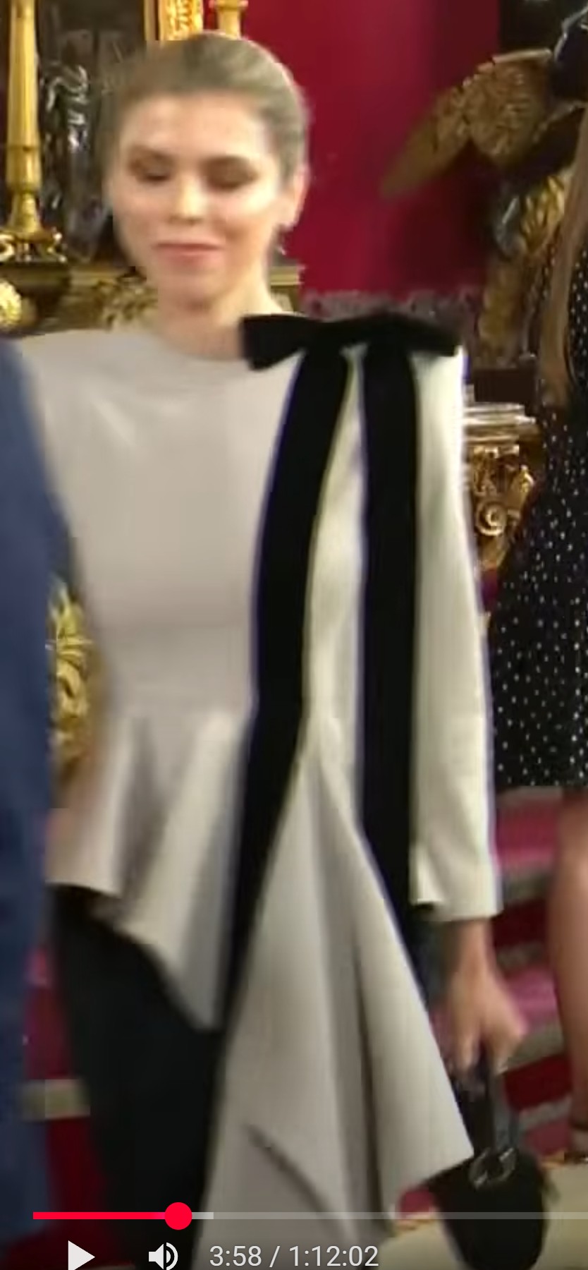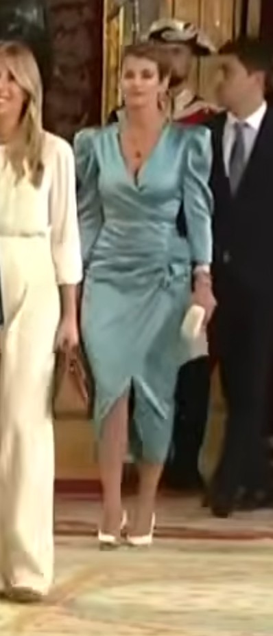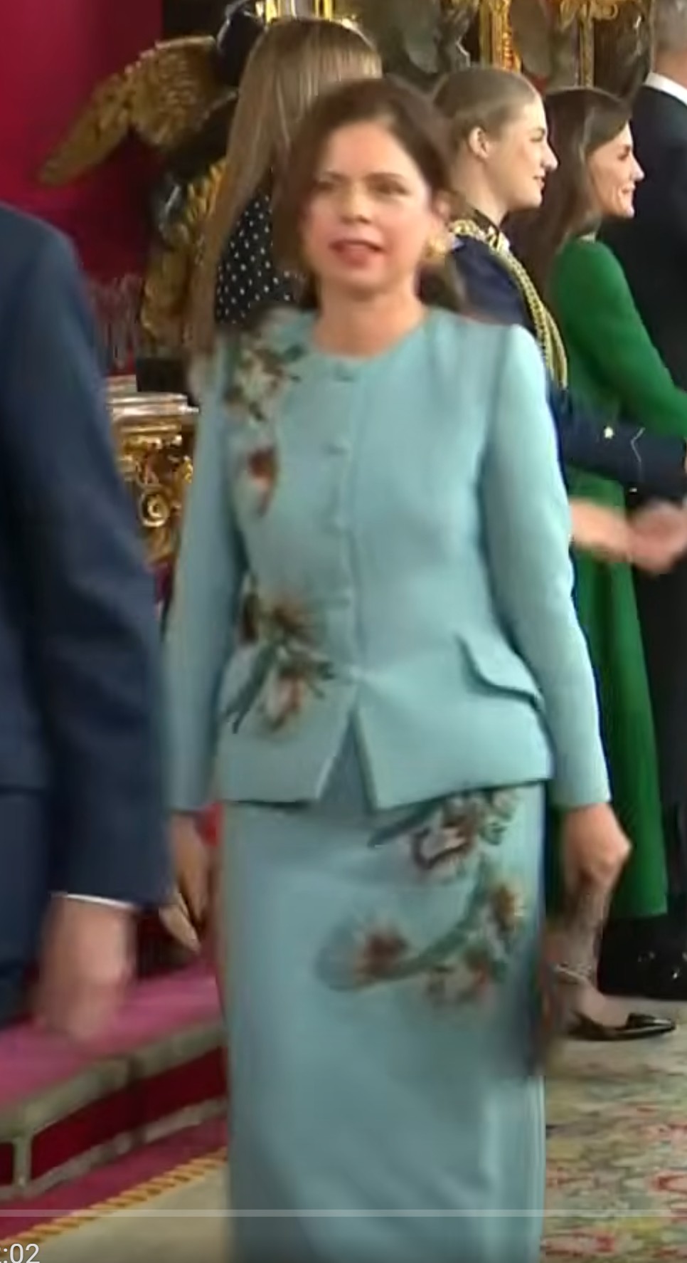 Esta dama ha aparecido con un vestido ceñido y elegante, me ha gustado pero creo que a Letizia no le quedaría bien, por la altura de la falda y porqueno tiene mucho con que llenarlo; pero lo quise poner para que veamos que hay gente que sí se esmera para lucir bien cuando se celebra la fiesta de su propio país.