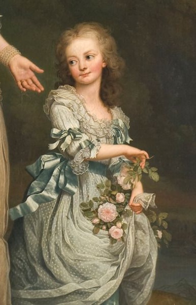 No era del todo su culpa, pero la hija de Marie Antoinette, Maria Teresa era una chiquilla arrogante e insufrible. Hasta en el retrato familiar aparece con sus grades ojos claros y su boca en un rictus de disgusto porque seguramente la obligaban a estarse quieta para la foto. Era costumbre traerle niños pobres para que jugaran con ella, pero bajo la condición de que debían rendirle toda la pleitesía del caso. También los cortesanos que esperaban favores en el futuro, se desvivían en atenciones con ella y como consecuencia, la chica creía que el universo le pertenecía y que la Tierra era su patio de juegos.