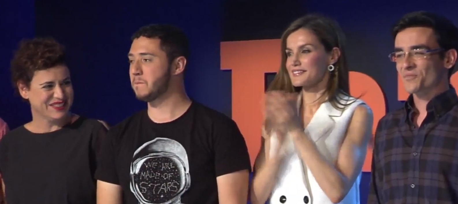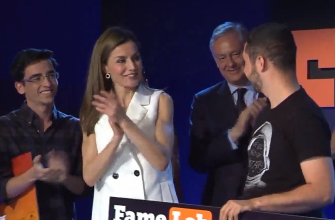 Hola amig@s: Estoy viendo el video de FAMELAB España y me he reído un montón. Es un evento interesante y divertido. Ya salieron las fotos del estilismo de la Reina, que asistió a ese evento hoy. Aquí os dejo un par y más tarde subo más y si sale algún video, lo subo también: