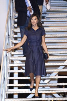 Doña Letizia echó de fondo de armario con un vestido camisero en denim de la firma Carolina Herrera que estrenó en su reciente viaje a Mozambique al descender del avión real.