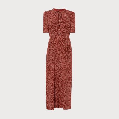 Muy al estilo ‘Kate’ este vestido de seda de estampado mínimo en camel y blanco sobre rojo. Da efecto vestido midi, pero se trata de un culotte. Me gusta el contraste ñoño del top con la modernidad de los pantalones. Lo firma L. K. Bennett.