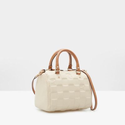 De bolso, saco del Kiki-Armario, la versión mini de corte barril de Purificación García en bicolor blanco y camel.