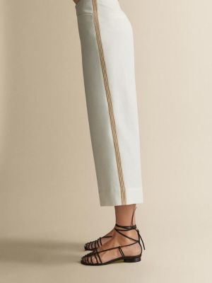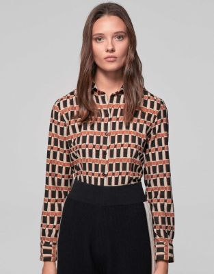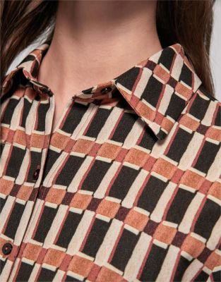 Ahora combino una blusa camisera de estampado geométrico de Roberto Verino en estampado tricolor: camel, blanco roto y negro con unos culottes en blanco roto de Massimo Dutti en algodón y lino con franja lateral.