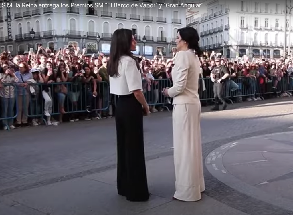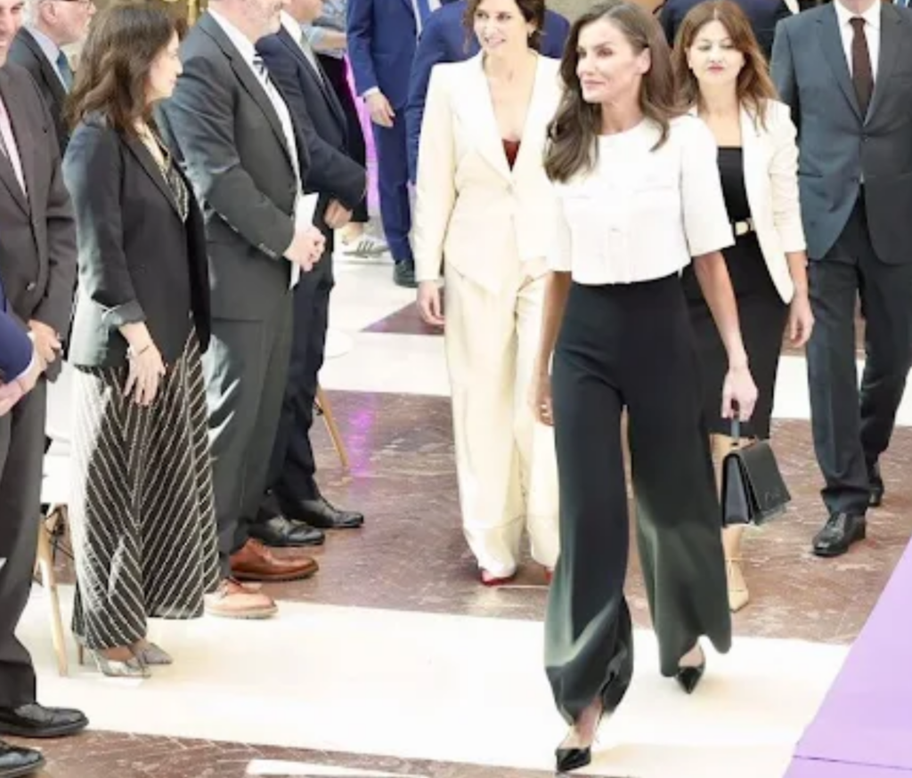 La Reina ha lucido una hermosa chaqueta, muy elegante y que parece costosa, con unos pantalones austados bien arriba de la cintura, que le alargaban la figura y la favorecían mucho, haciéndola parecer más alta. Los brazos pelados le quitan mucho al atuendo, pudiendo -ahora sí- lucir alguna alhaja espectacular. Se ve que los pantalones de bota ancha están de moda, pues otras dos señoras lucían estilos similares.
