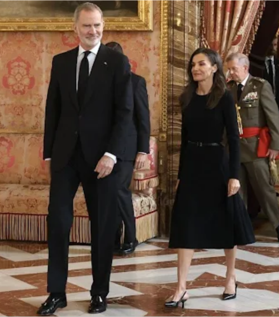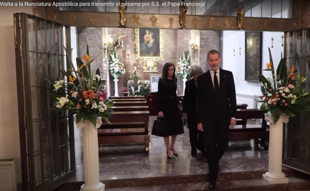 Letizia, Felipe y Sofía (abuela) visitaron la Nunciatura Apostólica para dar el pésame por la muerte del Papa. Letizia se presentó muy apropiada con un vestido negrísimo y recatad. Acertadamente no lució joyas, pues no era el lugar para ellas, y el pelo lo llevaba bien cepillado. Lo único que me chirrea es el pequeño cinturoncillo con el que parte el atuendo por la mitad. Entiendo que necesite darle alguna forma a su vestuario, pero ¿por qué no emplear un poco de creatividad y hacerse crear un diseño exclusivo, «apretadito, apretadito» en la parte media, cosa que no sea necesario un cinturón? ¿Será muy complicado?
