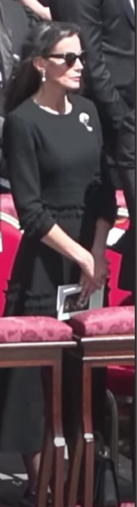 Letizia asistió compañada por su marido al funeral del Papa Francisco. Llevaba un vestido queme pareció muy bonito, especialmente porque no utilizó cinturoncillo para amarrarselo en la mitad, y eso se agradece. Iba muy bien peinada y por supuesto llevaba un espectacular broche y unos pendientes para representar completamente la Corona. Muy bien por ella en esta ocasión.
