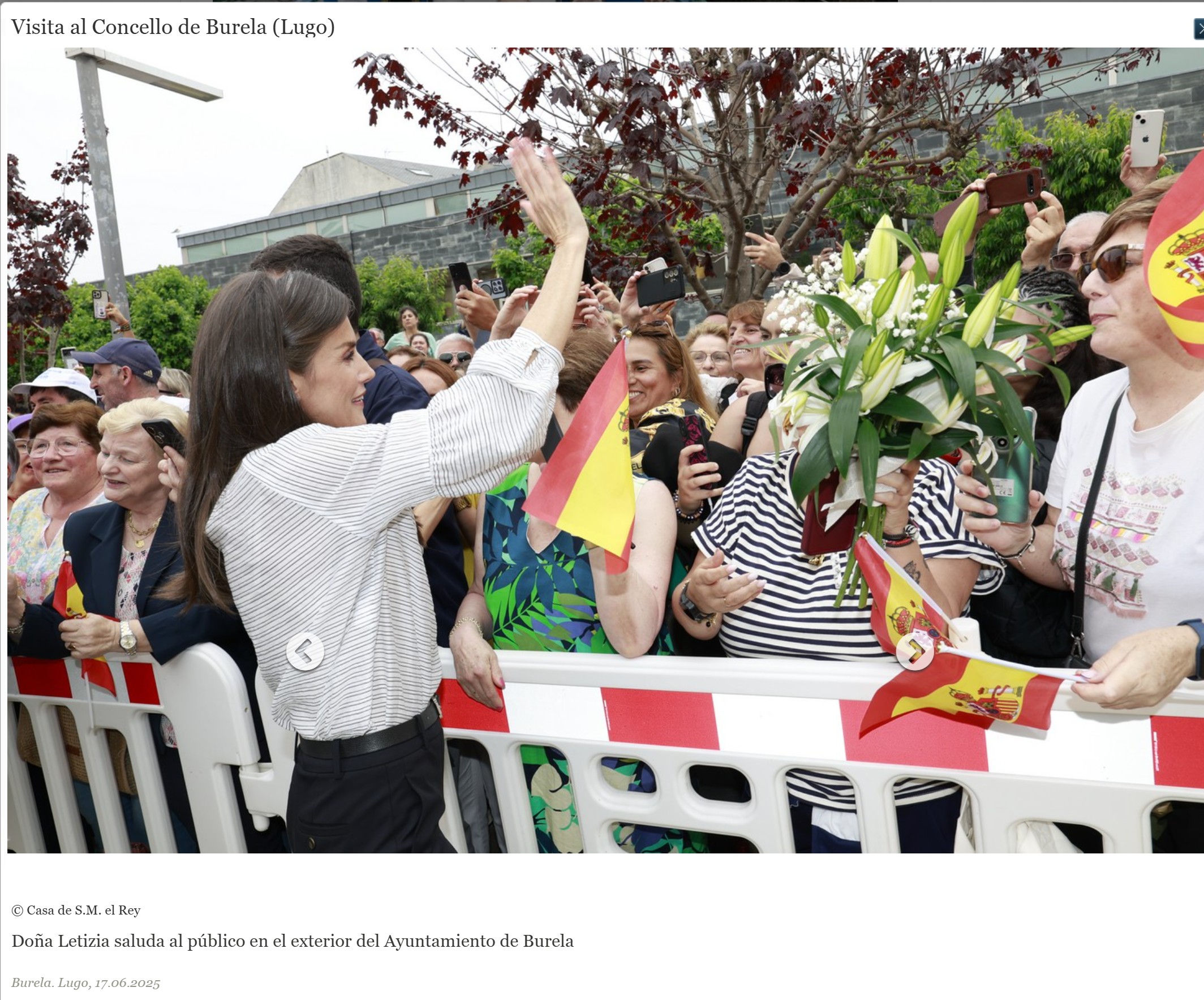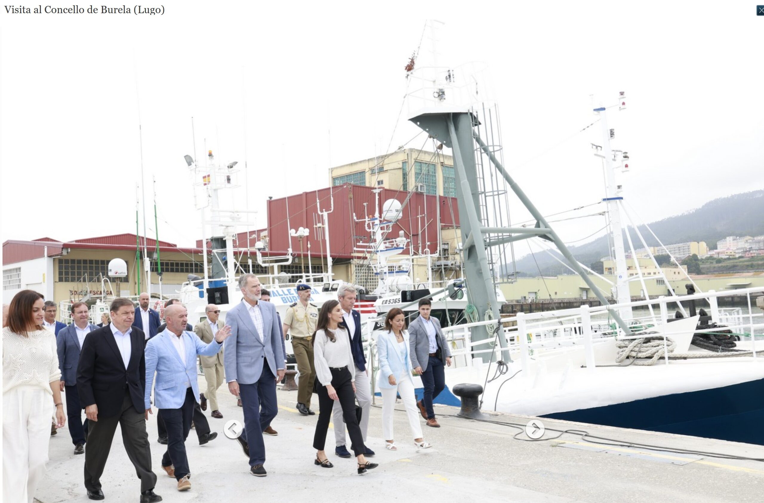 Según la Casa Real «Sus Majestades los Reyes han realizado una visita al Concello de Burela (Lugo), un pueblo marinero por excelencia, con una fuerte tradición pesquera y una economía basada en la pesca, con sus orígenes en el siglo XVI a través de la actividad ballenera.»