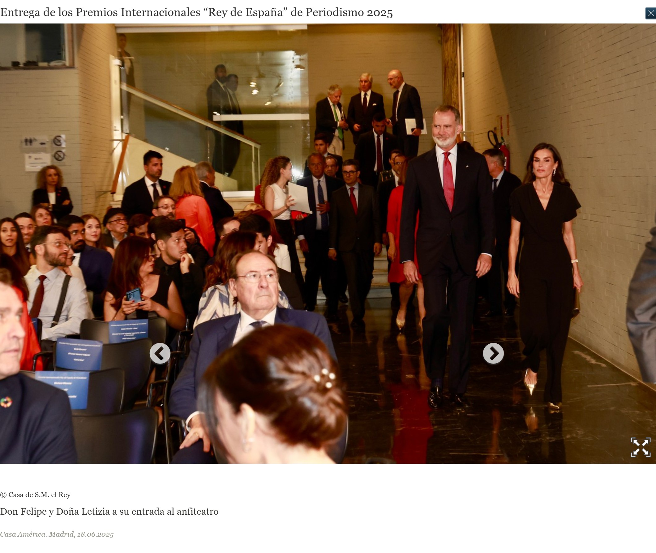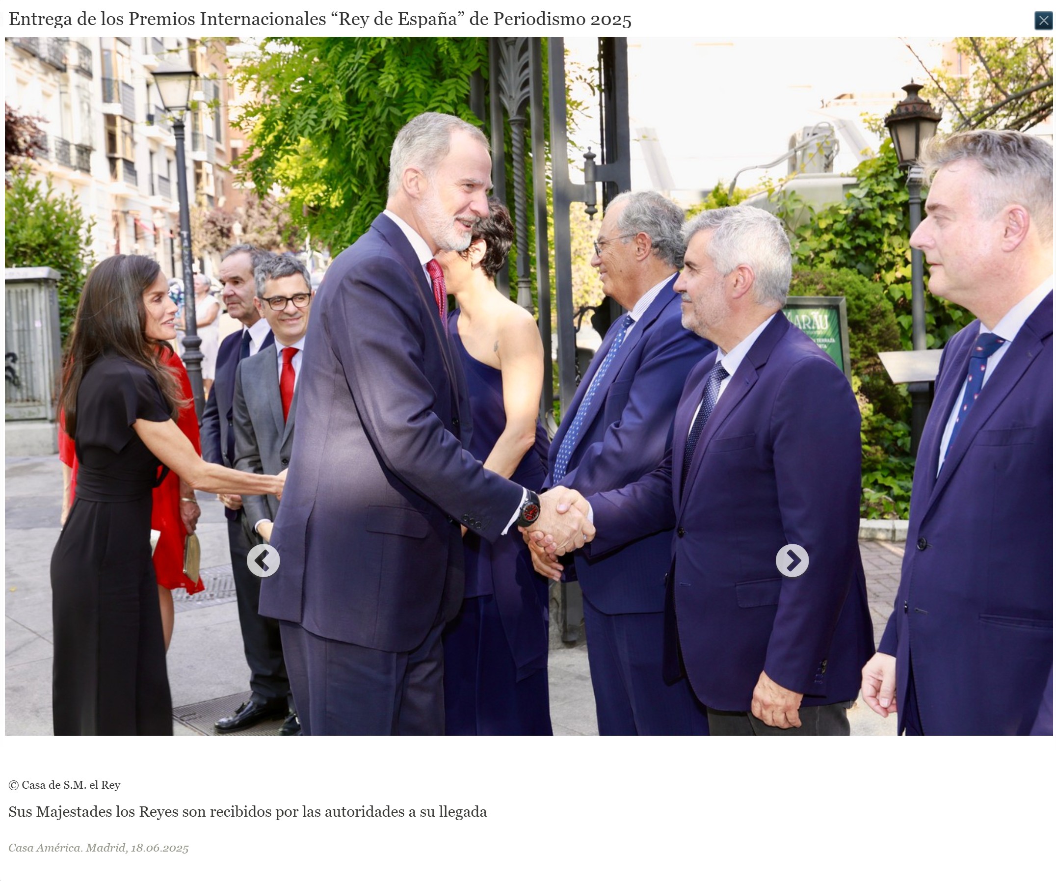 La Casa Real dice «Sus Majestades los Reyes entregaron los Premios Internacionales “Rey de España” de Periodismo 2025 que, en esta ocasión, han reconocido la lucha por la libertad de prensa en Nicaragua (La Prensa) y Venezuela (plataforma periodística CONNECTAS); el valor del periodismo transfronterizo; la mirada a los desprotegidos en Brasil; la figura de mujer moderna de la primera santa argentina y la investigación del agua contaminada en España.»