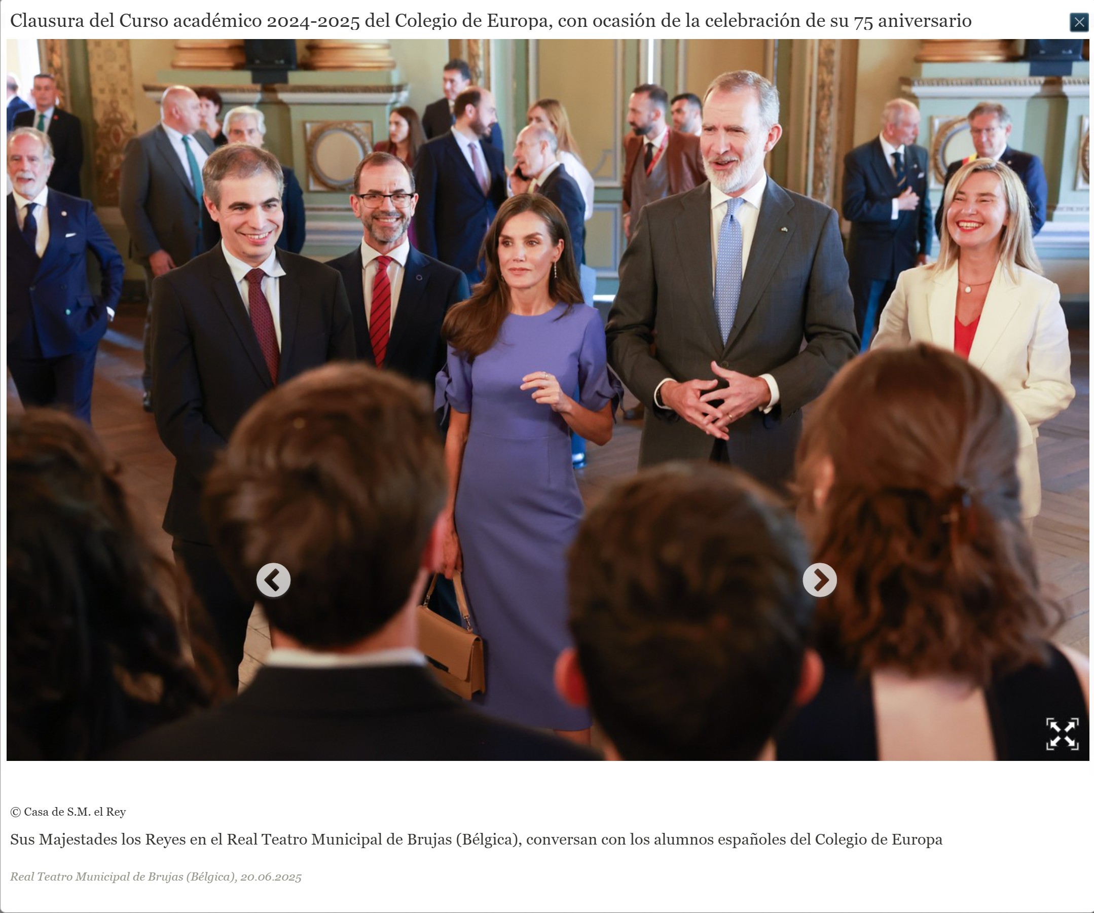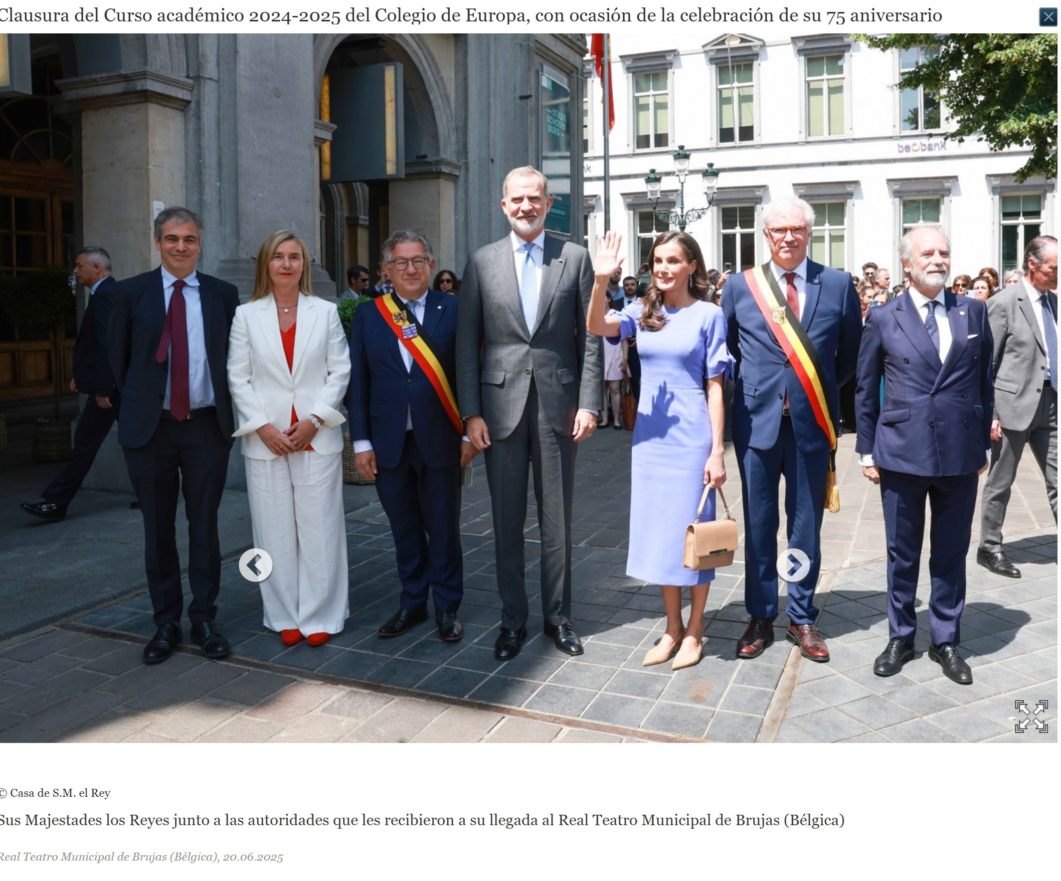 De acuerdo con la Casa Real «Sus Majestades los Reyes asistieron al acto de clausura del Curso académico 2024/2025 del Colegio de Europa, con ocasión de la celebración de su 75º aniversario»