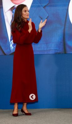 Otra vez Letizia luce un vestido de un largo que no favorece sus piernas demasiado delgadas. Ella debe usar la falda un poco más corta. Repito «un poco» no una microminifalda o un «Nancy patinadora» solo una falda un poco más corta que no resalte y enmarque la delgadez de sus tobillos.