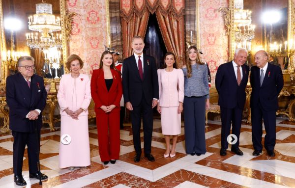 Letizia y Sofía (madre) se coordinaron para lucir exactamente el mismo atuendo color rosado. Sofía sobria y regia como ella sabe, utilizó el largo que le conviene, joyas adecuadas a su rango, y chaqueta sin estridencias. Letizia, utilizó una falda más corta que le favorece las piernas porque las hace ver un poco más llenitas. Las hombreras de la chaqueta son muy llamativas, y el paño utilizado para el conjunto es muy elegante.