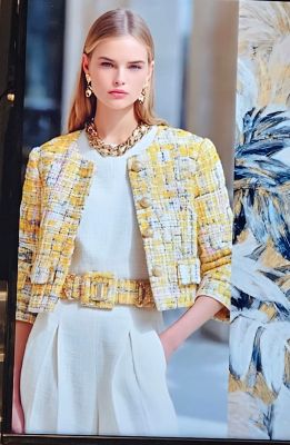 Nuestra asesora dice que este atuendo de pantalón blanco con chaquetilla amarilla le quedaría lindo a Letizia, le daría un poco de color, y la sacaría de los aburridos grises y negros.