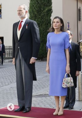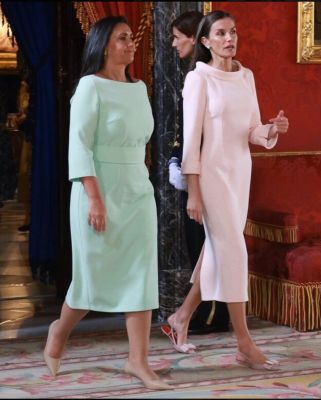 El color del vestido tiene encanto, pero el corte no termina de ayudar: el largo deja demasiado protagonismo a unas piernas muy delgadas y algo curvadas, y las mangas tampoco son amigas de sus brazos, sino que remarcan esa delgadez. A veces parece que la Reina insiste en elegir lo más simple posible… y simple no siempre significa acertado.