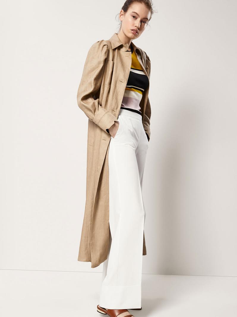 A partir de esto comienzo el rescate. Empecemos por el segundo y tercer punto: selecciono un abrigo levita en rojo de Zara (49.95) y lo combino con unos pantalones bancos de Massimo Dutti (79.95).
