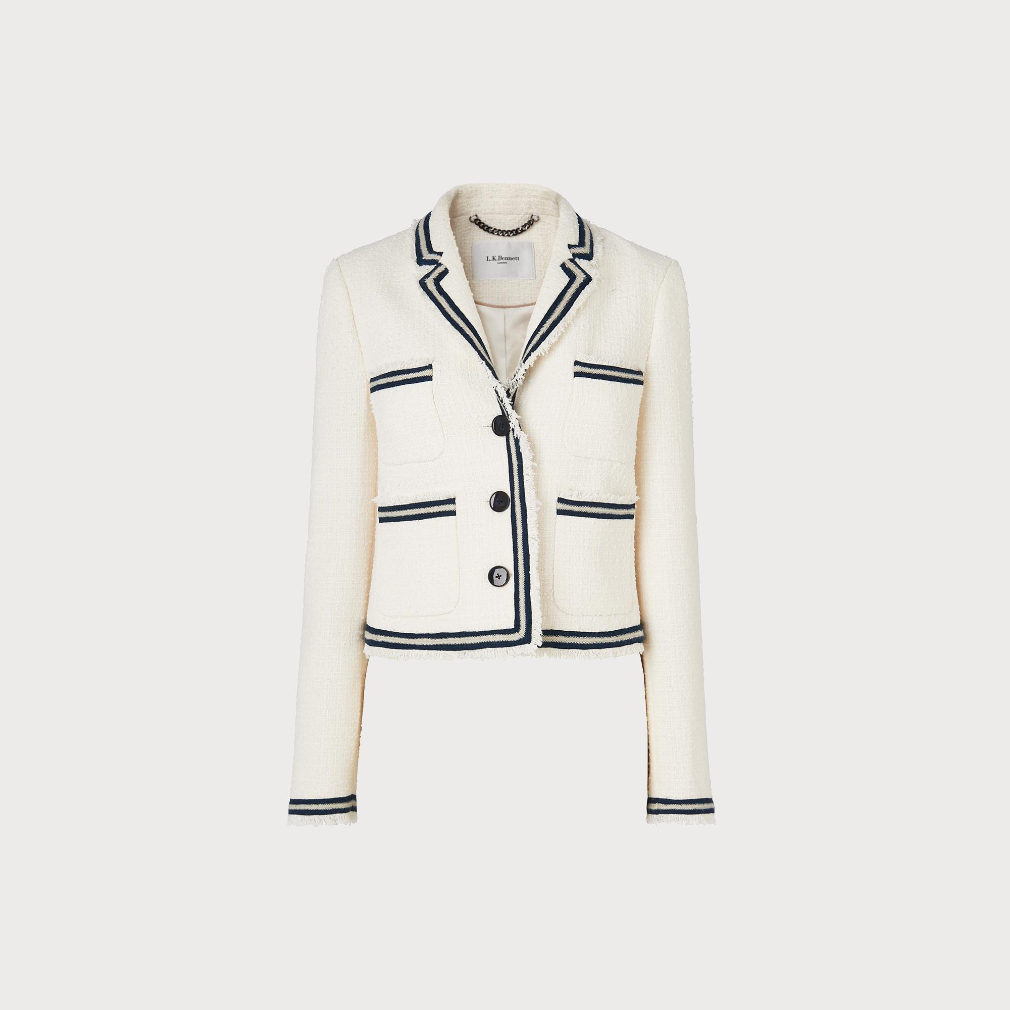 Creo que la anhelada falda azul en línea A y cuchilla central de Nina Ricci merece una salida. Ideal para una visita al extranjero donde se ha de ir de reina sin pasarse. La he combinado con una chaqueta de algodón de L. K. Bennett en blanco con ribetes azul marino de algodón. Acorde con los 24 grados de la capital italiana. Precio: 360 euros.
