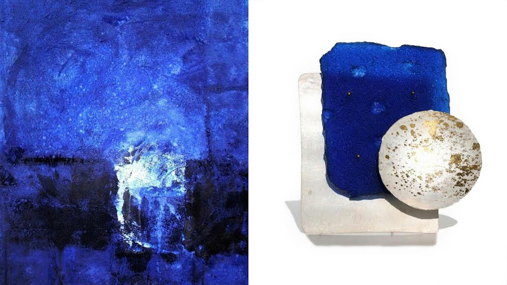 De accesorio joya, voy por un guiño al país anfitrión con este broche en azul Klein, metal y nacarado de Maria Rosa Franzin junto a sus aros de oro de Arabel Lebrusan.