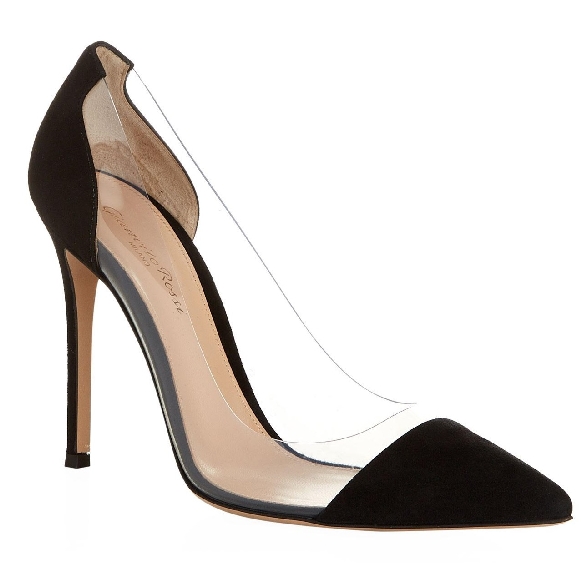 Cambio de salones: Propongo estos clásicos de Gianvito Rossi en vinilo y negro. El remate en puntera y talón nos espeja la franja del vestido. Son modernos a la par que royals.