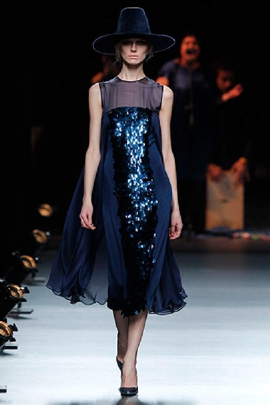 De Juan Duyos, este magnífico vestido de chiffon de seda y panel de pailletes en azul, con escote a la caja, se vuelo y sin mangas como le gusta a la Reina.