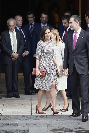 De nuevo ha sacado los salones de Magrit en tono teja a juego con el bolso diseñados en exclusiva para ella que combina charol y ante. Parece que se han convertido en el dúo favorito de la Reina. Para mí está es la primera vez que los luce en todo su esplendor: el tono teja suma al estilismo sin sobrecogerlo. Excelente uso de los complementos. Ni le veo lo cucharudo a los zapatos. Bien.