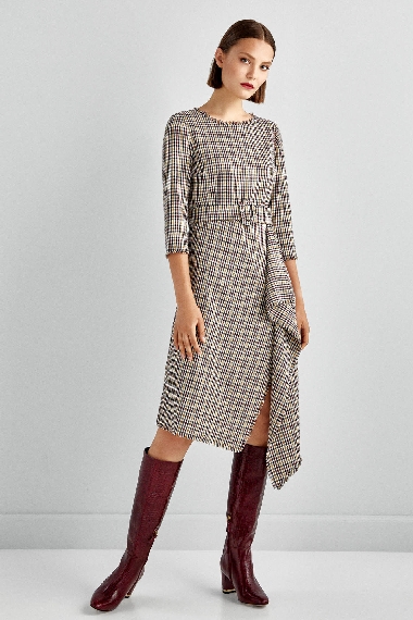 Doña Letizia estrenó un vestido de cuadros vichy en tonos tierra, de cinturón ancho, manga francesa y detalle de caída lateral en la falda con abertura. Una tendencia muy favorecedora, pues alarga la figura. Lo firma Pedro del Hierro y está de rebajas en 143 euros.