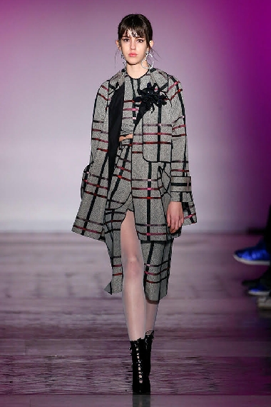 De Juan Vidal, este conjunto invernal de tres piezas: chaquetón, falda tubo y top de cuadros rojizos y violetas sobre gris. OJO: Ajustar la blusa y la falda a una reina, quien desde luego no debe enseñar tanta pierna y menos barriga.