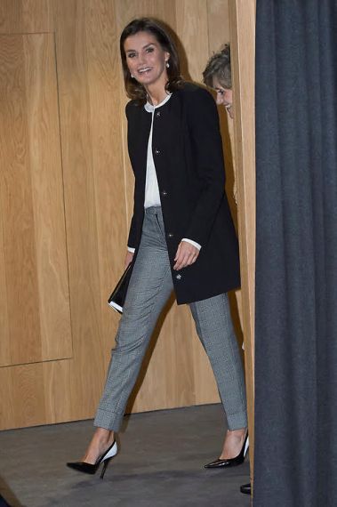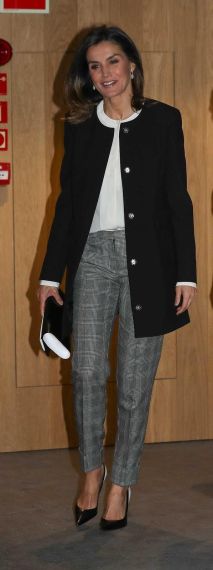 Parece que Doña Letizia hubiera echado de fondo de armario con uno de sus looks escolares, pero no. Estrena otra blusa blanca más; y otros pantalones a cuadros que se unen a los otros cinco que ya están en el armario real. Ambas prendas de Hugo Boss.