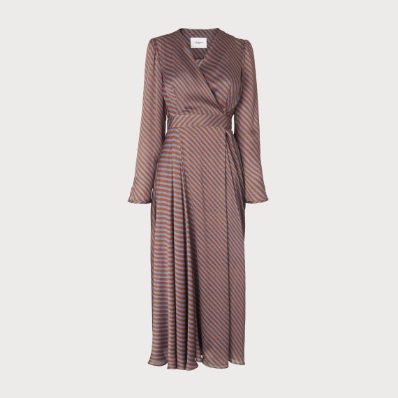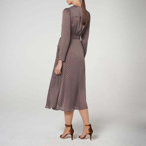 De L. K. Bennet, este vestido de escote en V de falso wrap con una falda en dos pliegues, de rayas granate y grises en seda y mangas largas. Modelo Loreta. Precio: 420 euros.