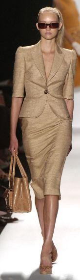 De Oscar de la Renta, este conjunto de dos piezas en tono paja de lana y seda. OJO: Ajustado en talla –no apretado- y escote.