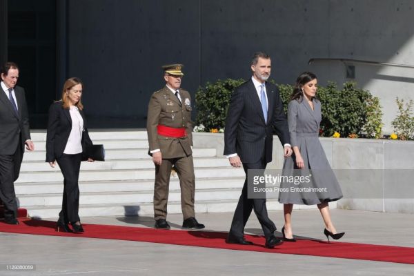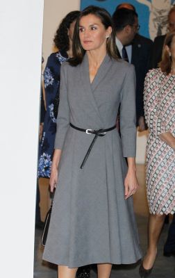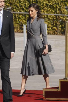Doña Letizia recicla un vestido gris de escote faux wrap y falda amplia que estrenó a comienzos de diciembre para asistir al Museo Reina Sofía. Se trata de otro vestido misterio: O se lo hizo la costurera de Palacio o perteneció a la Reina Sofía y no hay constancia gráfica.