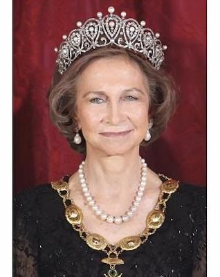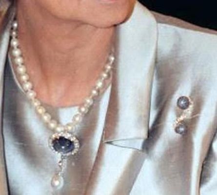 Cambio este joyón por otro: y ¿si optara por el collar y los pendientes de Doña Sofía (primera foto) combinado con el broche (segunda foto)? Creo que vestirían más el estilismo, ¿no les parece?