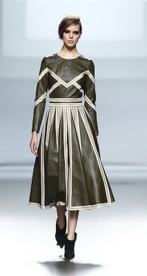 De Teresa Helbig, un vestido en piel verde sepia con franja bordada en estilo lady que tan bien le sienta a la Reina. Es de estructura conservadora, pero el tono y la piel nappa suman fashion y dan el toque moderno sin perder el royal.