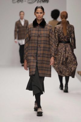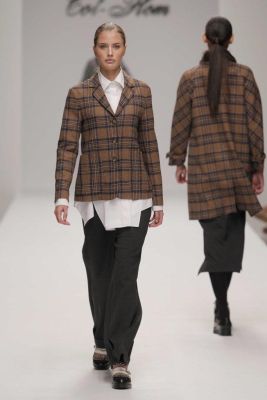 De Tot-Hom juego de chaqueta (primera foto) en cuadros ventana sobre falda asimétrica en gris carbón (segunda foto). Clásica con un twist.