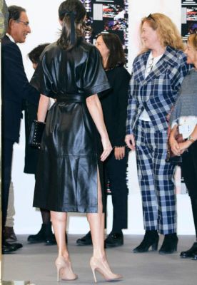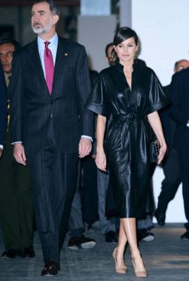 Doña Letizia estrena vestido y firma. Se trata de un vestido de corte kimono en piel de & Other Stories. Los 349 euros no me parecen excesivos. Lo ha combinado con los eternos Prada en nude y el bolsito caja de tachuelas de Uterque.