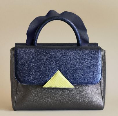 EL splash de color queda en este lindo bolso de mano de Tita Madrid en índigo,  acero y amarillo fluor sobre negro. La asa orleada da el toque romántico a este cuero negro.