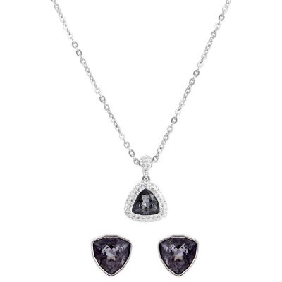 De accesorio joya, esta fina bisutería (pendientes y collar) en geometría en cristal de tono acero de Swarovski. El triángulo sigue la línea del llamativo broche del bolso.